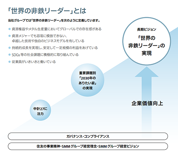 当社グループは、経営理念や経営ビジョンを基盤とし、資源の確保、非鉄金属や電池・機能性材料など高品質な材料の提供を通じ、成長性と持続性を拡大させることで企業価値を高め、長期ビジョン「世界の非鉄リーダー」を目指しています。この長期ビジョンを実現するために欠かせない、非財務価値に焦点を当てたものが重要課題別「2030年のありたい姿」です。