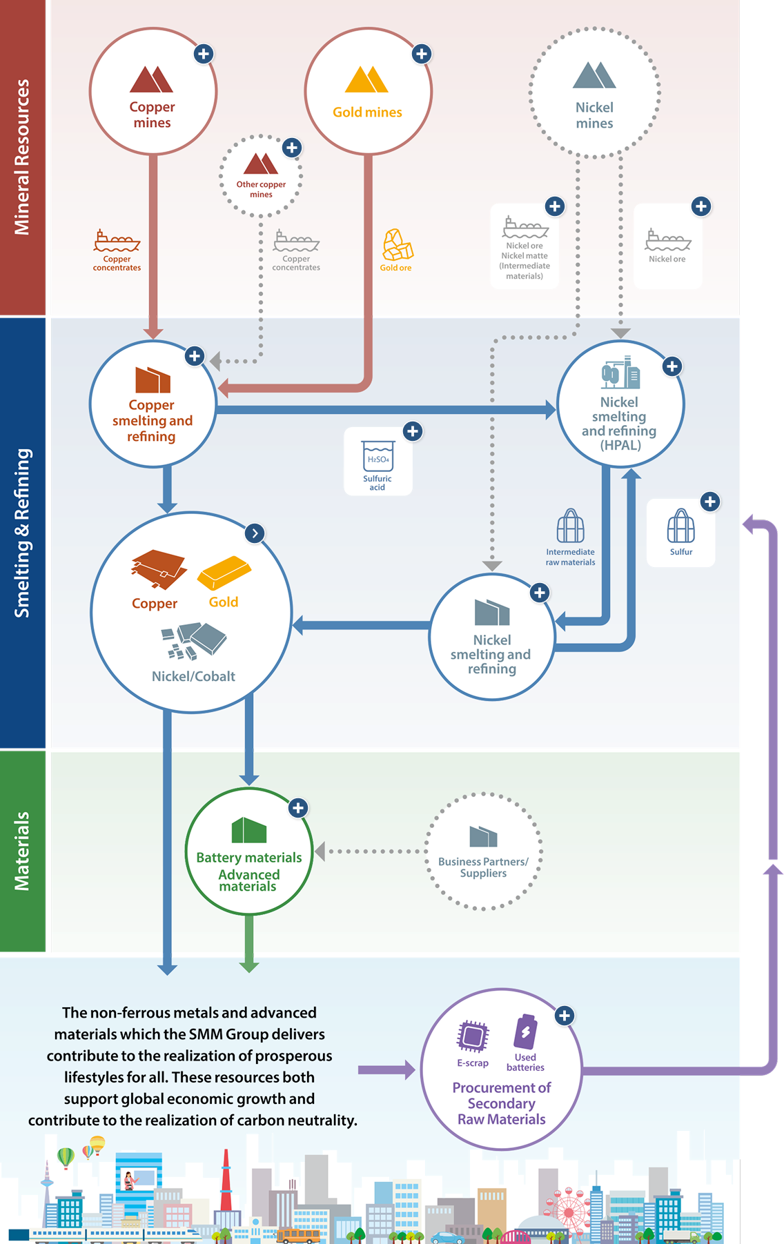Our business model integrates the three businesses of “Mineral Resources,” “Smelting & Refining,” and “Materials,” to handle everything from securing ore through to manufacturing products that contribute to a low carbon society and recycling. This diagram illustrates the flow of materials within our business model.