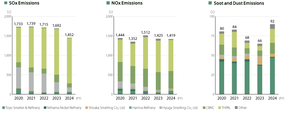 SOx emissions in FY2024 decreased by about 14% year on year. The main factors in this decrease were a reduction in the amount of processed raw materials by Hyuga Smelting Co., Ltd. and the degradation of sulfur (S) in coal used by Coral Bay Nickel Corporation (CBNC). A partial increase in NOx emissions was seen due to an increase in the amount of C heavy oil used at Toyo Smelter & Refinery, but the level used by the Group as a whole was nearly the same as the previous fiscal year. Soot and dust emissions increased by about 40% year on year. The main factors in this include an increase in exhaust gas due to high-capacity operations at CBNC, higher density of boiler exhaust gas, and problems with electric dust collectors that occurred at Taganito HPAL.