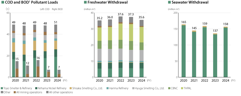 Many SMM Group business sites are located along Japan’s Seto Inland Sea and are subject to controls on the total amounts of COD1, nitrogen, and phosphorous emissions under the Act on Special Measures Concerning Conservation of the Environment of the Seto Inland Sea. In addition, we adhere to the discharge standards of the Water Pollution Prevention Act and have not had any violations in this area.