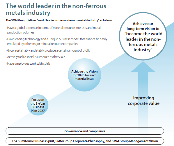 Drawing on its corporate philosophy and management vision, the SMM Group will expand its growth potential and sustainability by securing resources and providing non-ferrous metals, battery materials, advanced materials, and other high-quality materials in an effort to enhance its company value and achieve its long-term vision of becoming the world leader in the non-ferrous metals industry. The Vision for 2030 for each material issue is focused on non-financial value that is essential to achieve our long-term vision.