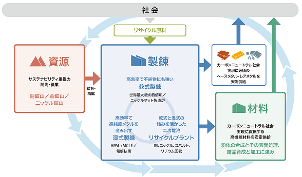 環境・社会に配慮した鉱山開発・運営を行う「資源事業」。採掘した鉱物資源から高品質な金属素材を生み出す「製錬事業」。そして、金属素材に時代が求める新たな価値を付加する「材料事業」。3つの事業が有機的な連携を図りながら、私たちは、未来を形づくる素材を提供しています。