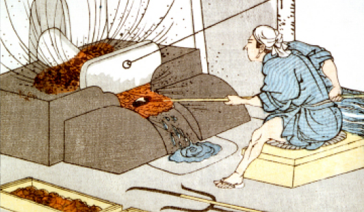 1590年、蘇我理右衛門が、泉屋と称して京都で銅製錬・銅細工を開業。ほどなくして、粗鋼から銀を分離する「南蛮吹き」という製錬技術を開発しました。当時の日本は、銅製錬の技術が未熟で、銀を含んだままの銅を輸出していたため、そのぶん富を損失していました。しかし、この南蛮吹きの確立により、銀を回収することが可能となって泉屋は繁栄。住友の事業基盤を築くまでの発展を遂げたのです。画期的な技術を開発した蘇我理右衛門は、これを独占することなく同業者にも広く公開。その結果、日本における銅産業は加速度的に発展を遂げました。